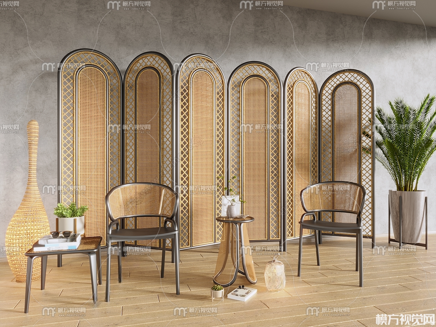 侘寂风藤编屏风隔断休闲椅3D模型(ID:0010271)