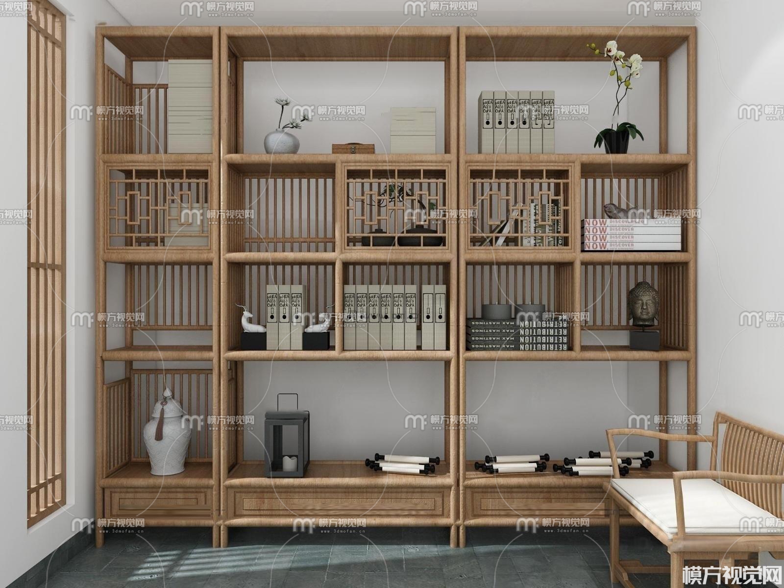 新中式博古架书籍摆件3D模型(ID:0010502)