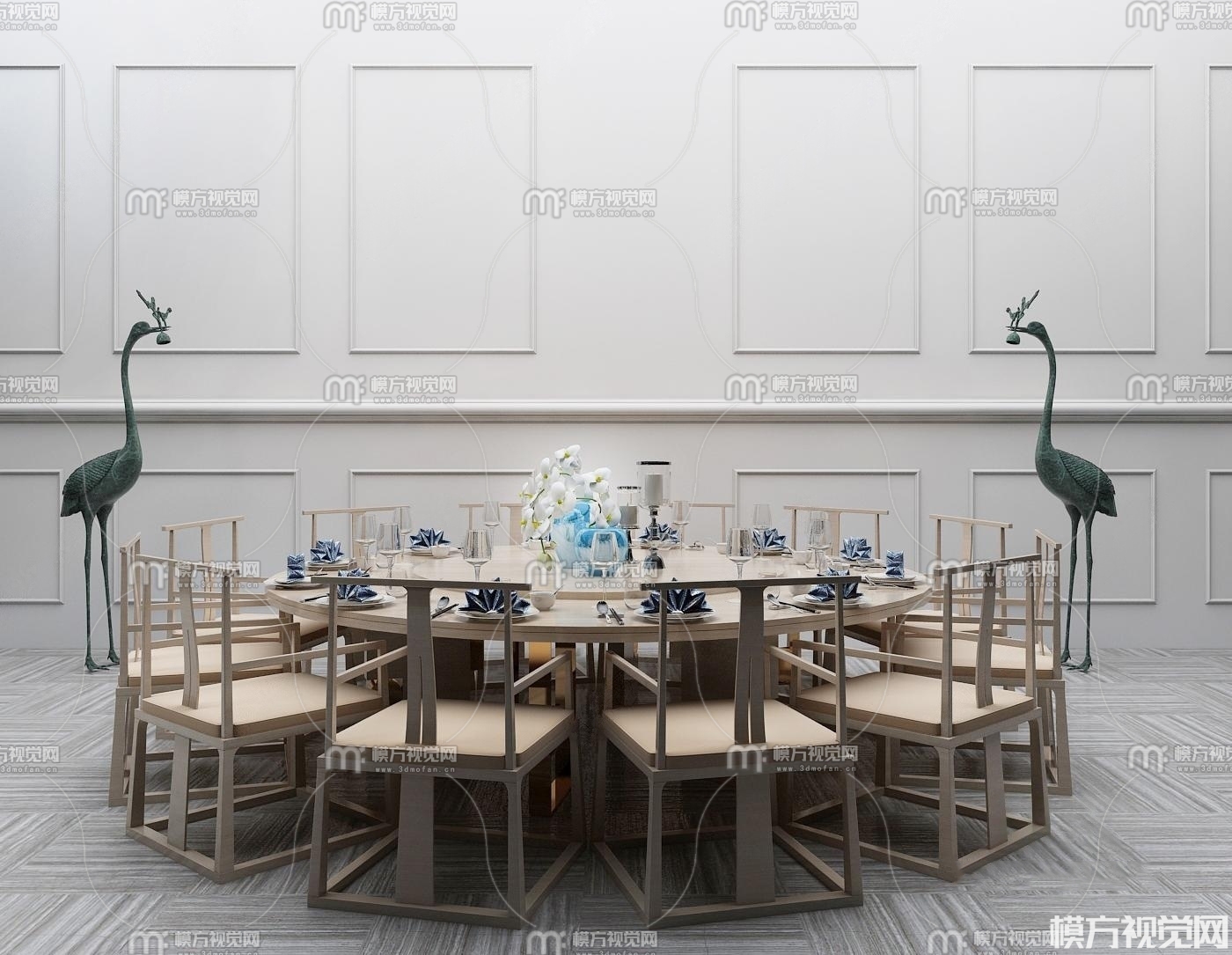 新中式圆形餐桌椅餐具摆件组合3D模型(ID:0010665)