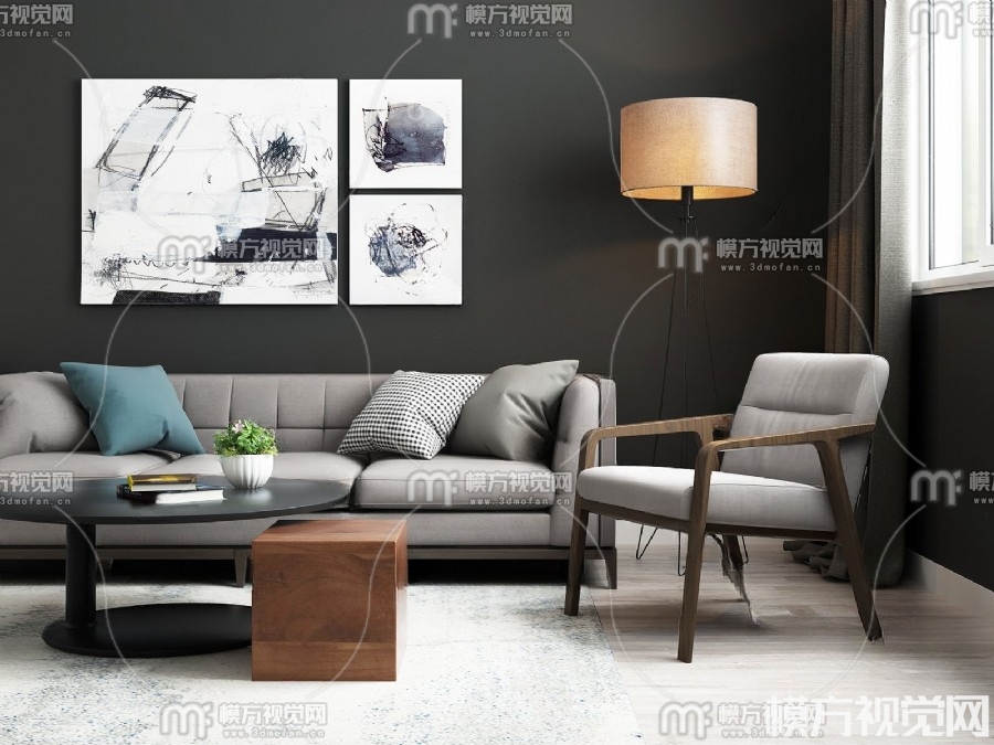 现代沙发茶几 落地灯 装饰画3D模型(ID:0001076)