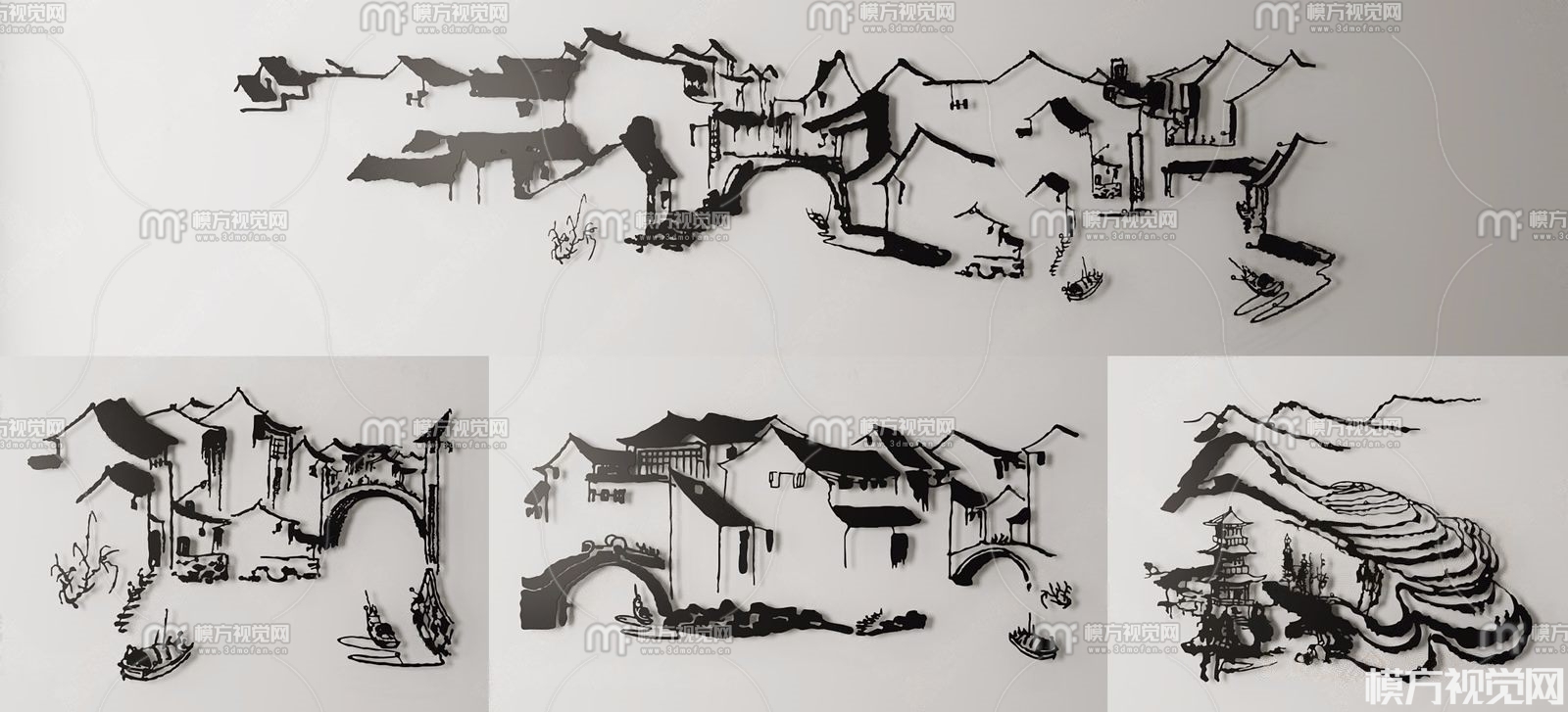 新中式铁艺山水画墙饰组合3D模型(ID:0010763)