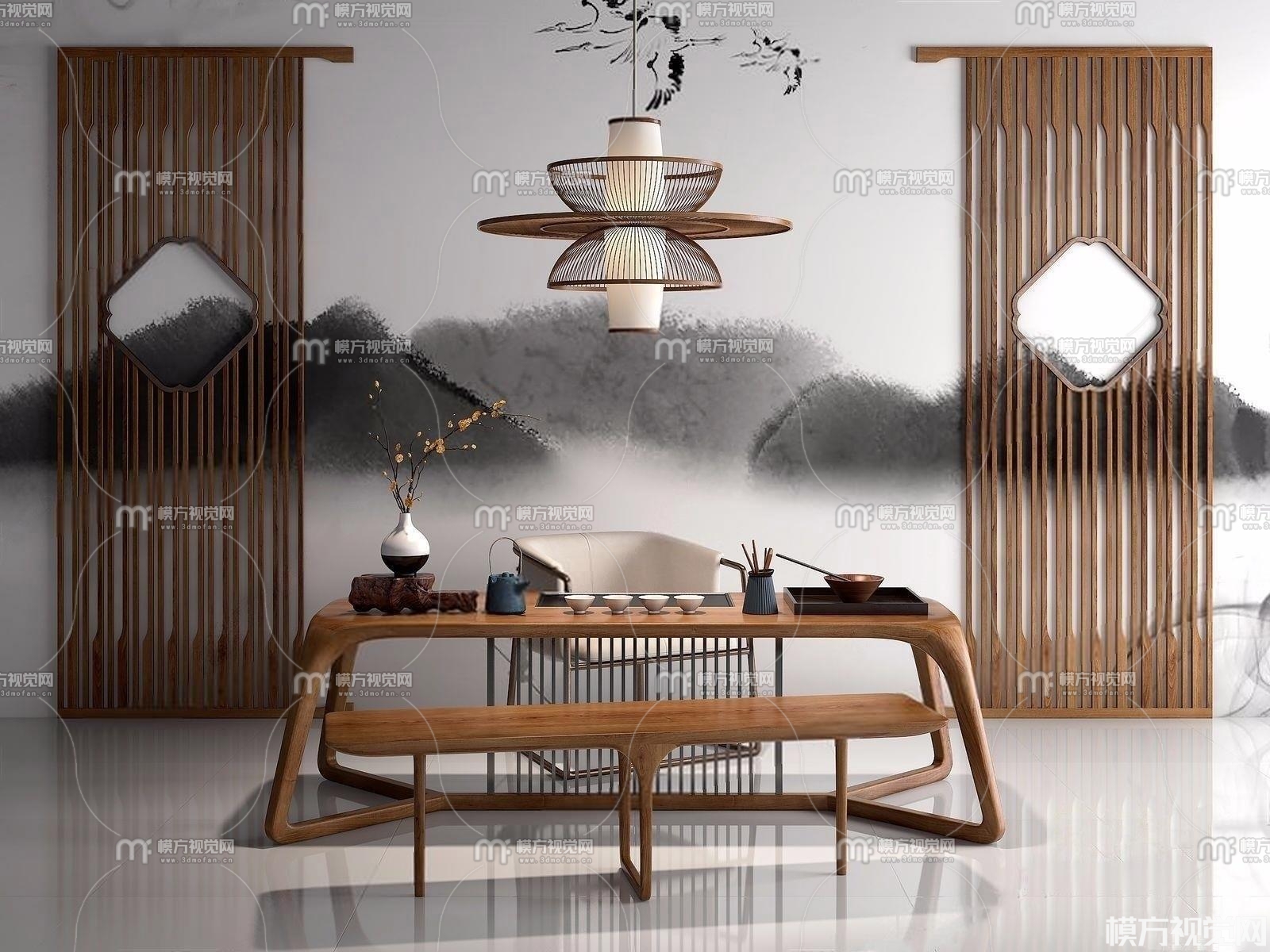 新中式禅意茶桌椅吊灯组合3D模型(ID:0010875)