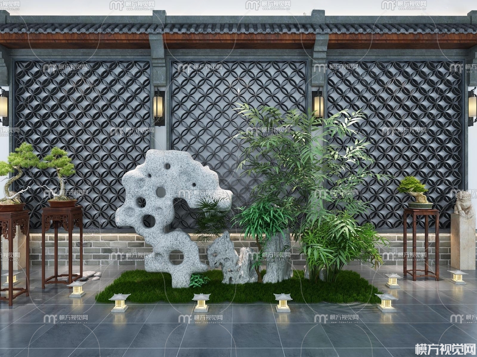 新中式景观墙竹子假山景观小品3D模型(ID:0011000)