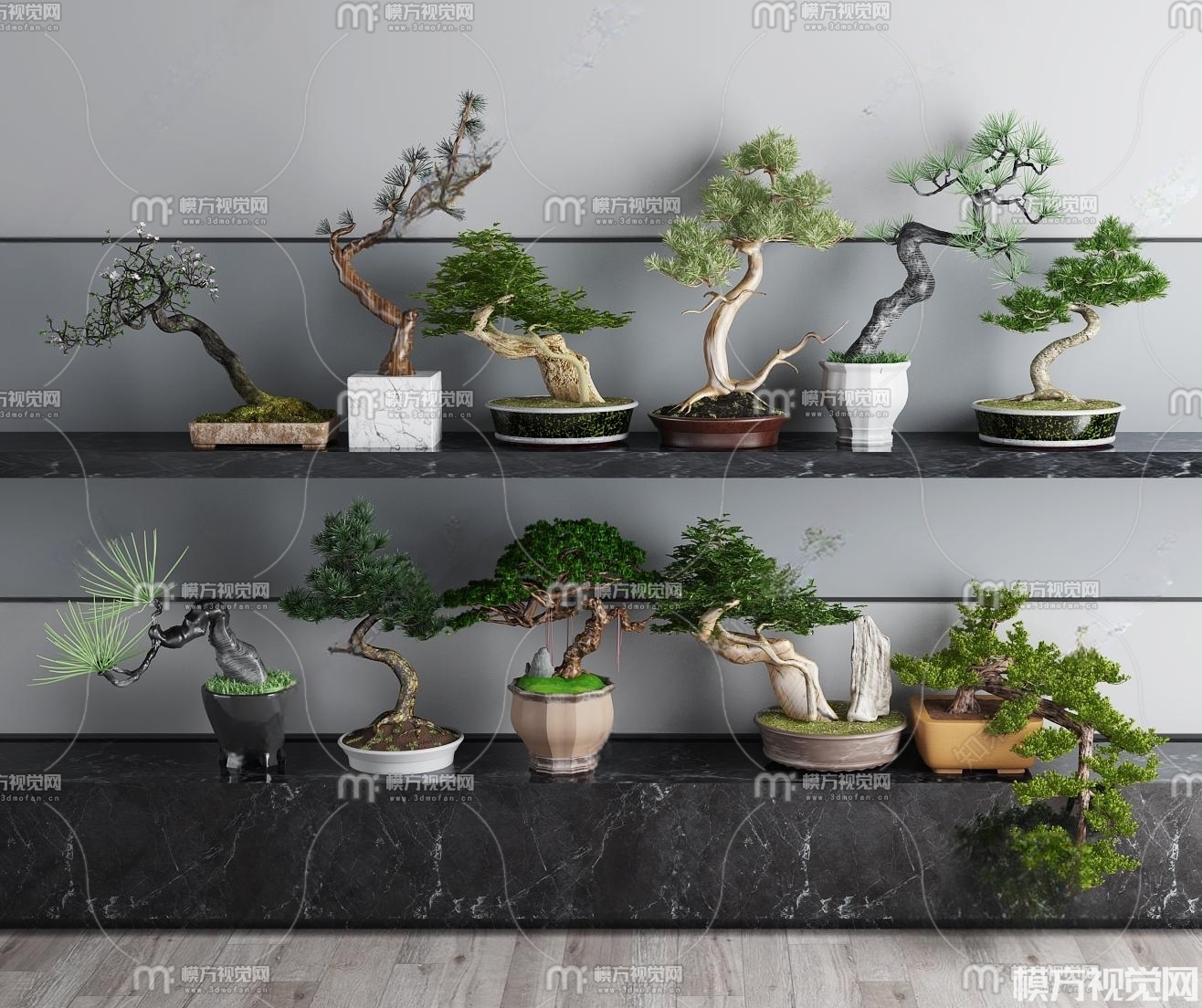 新中式罗汉松盆景组合3D模型(ID:0011121)