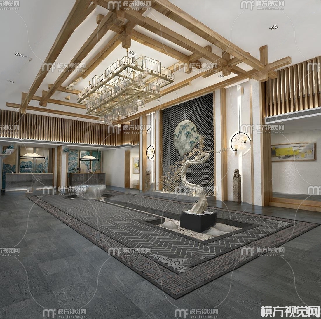 新中式民宿酒店前台大堂3D模型(ID:0011140)