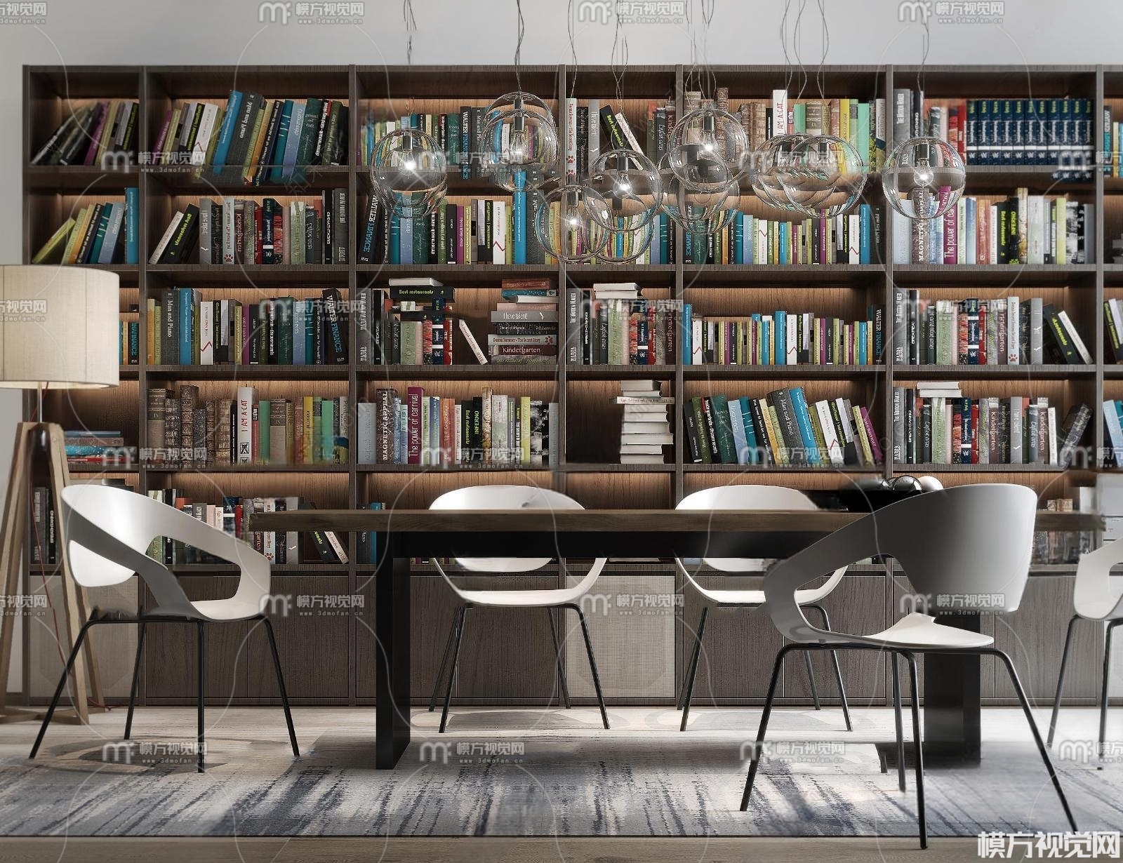 现代桌椅书柜书籍吊灯组合3D模型(ID:0011280)