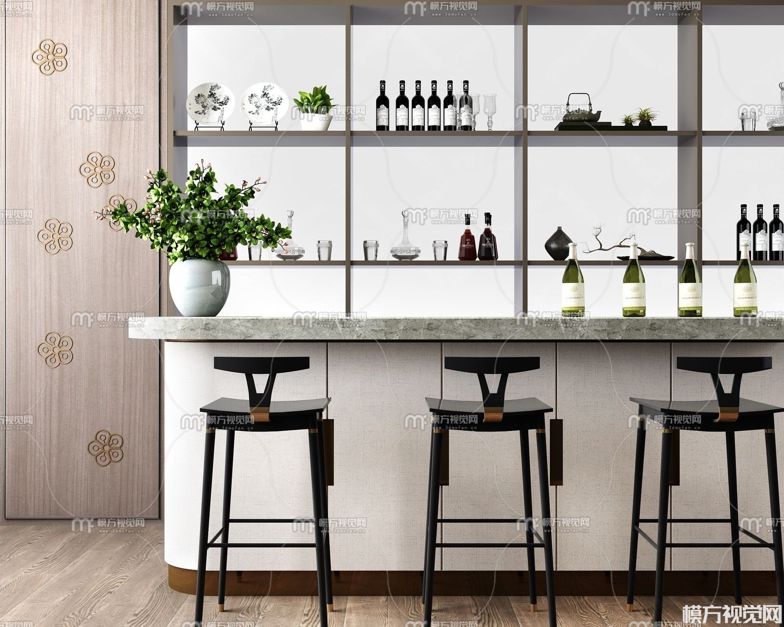 新中式吧台吧椅酒柜组合3D模型(ID:0011308)