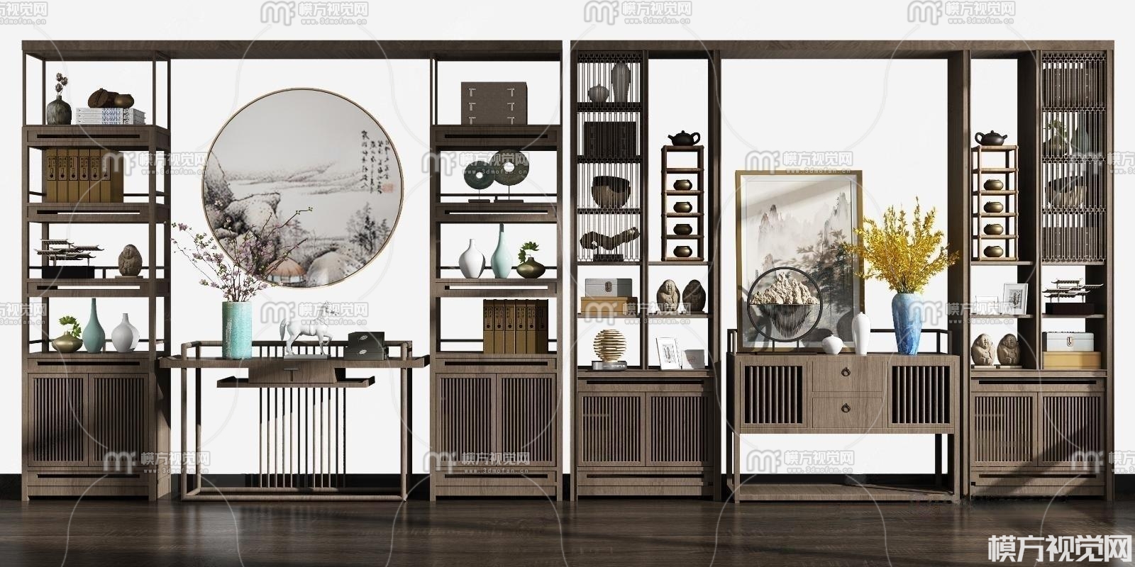 新中式博古架端景条案组合3D模型(ID:0011344)
