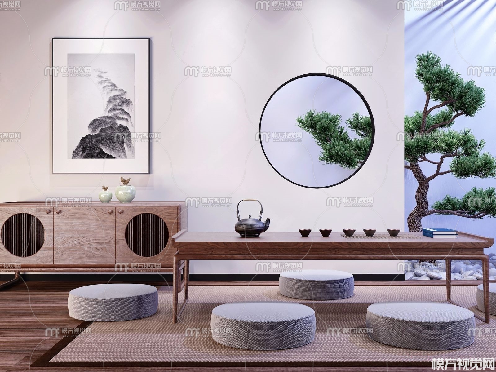 新中式茶桌边柜组合3D模型(ID:0011423)