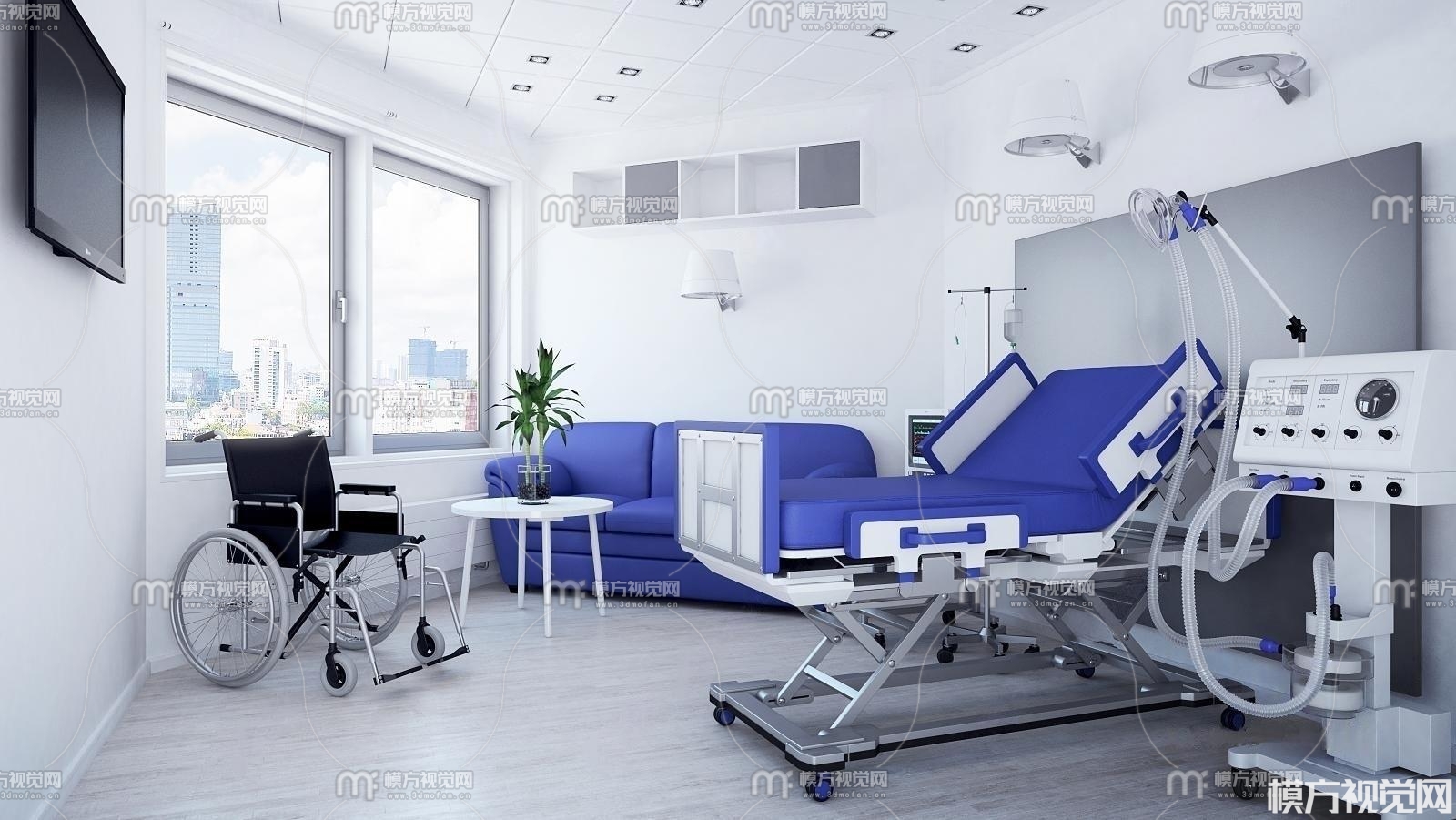 现代医院病房 轮椅 呼吸机组合3D模型(ID:0011721)