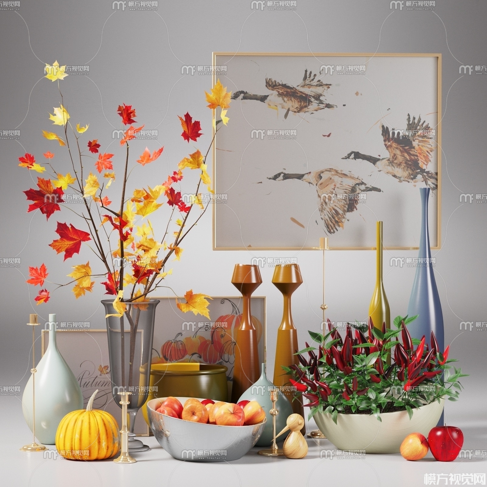 现代枫叶花瓶辣椒挂画摆件3D模型(ID:0012059)