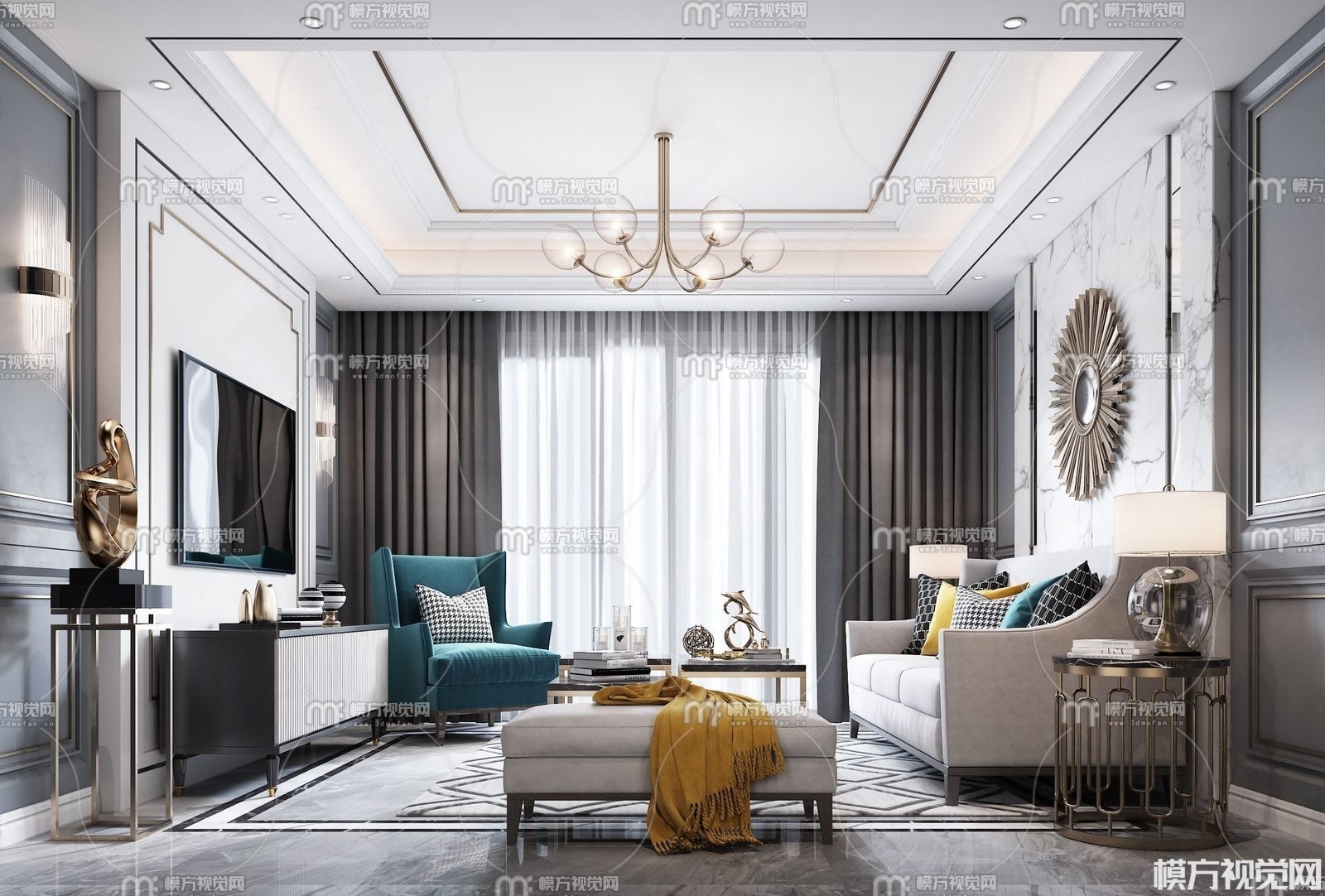 美式轻奢客厅3D模型(ID:0013119)