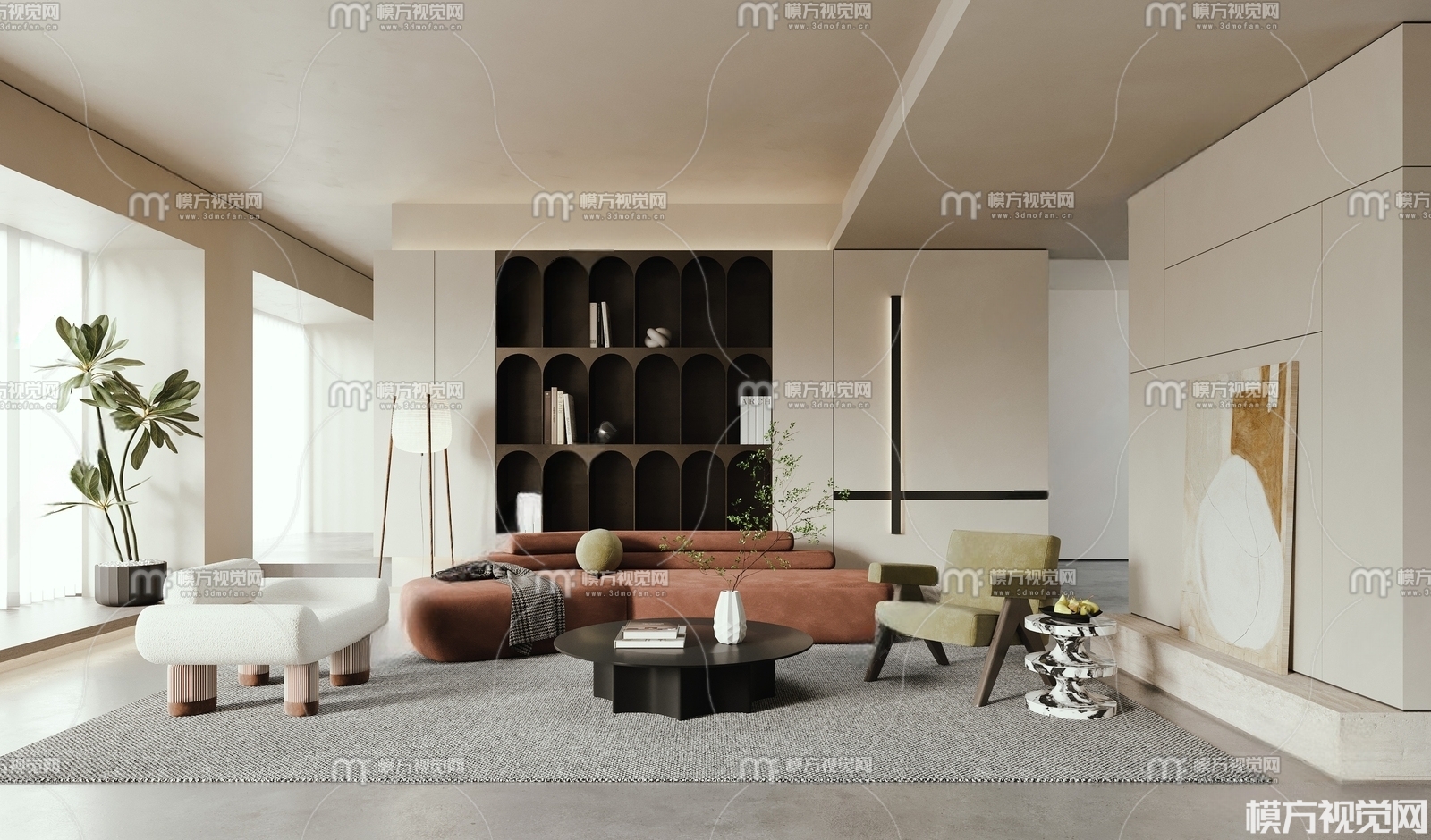 侘寂风布艺沙发组合3D模型(ID:0013218)