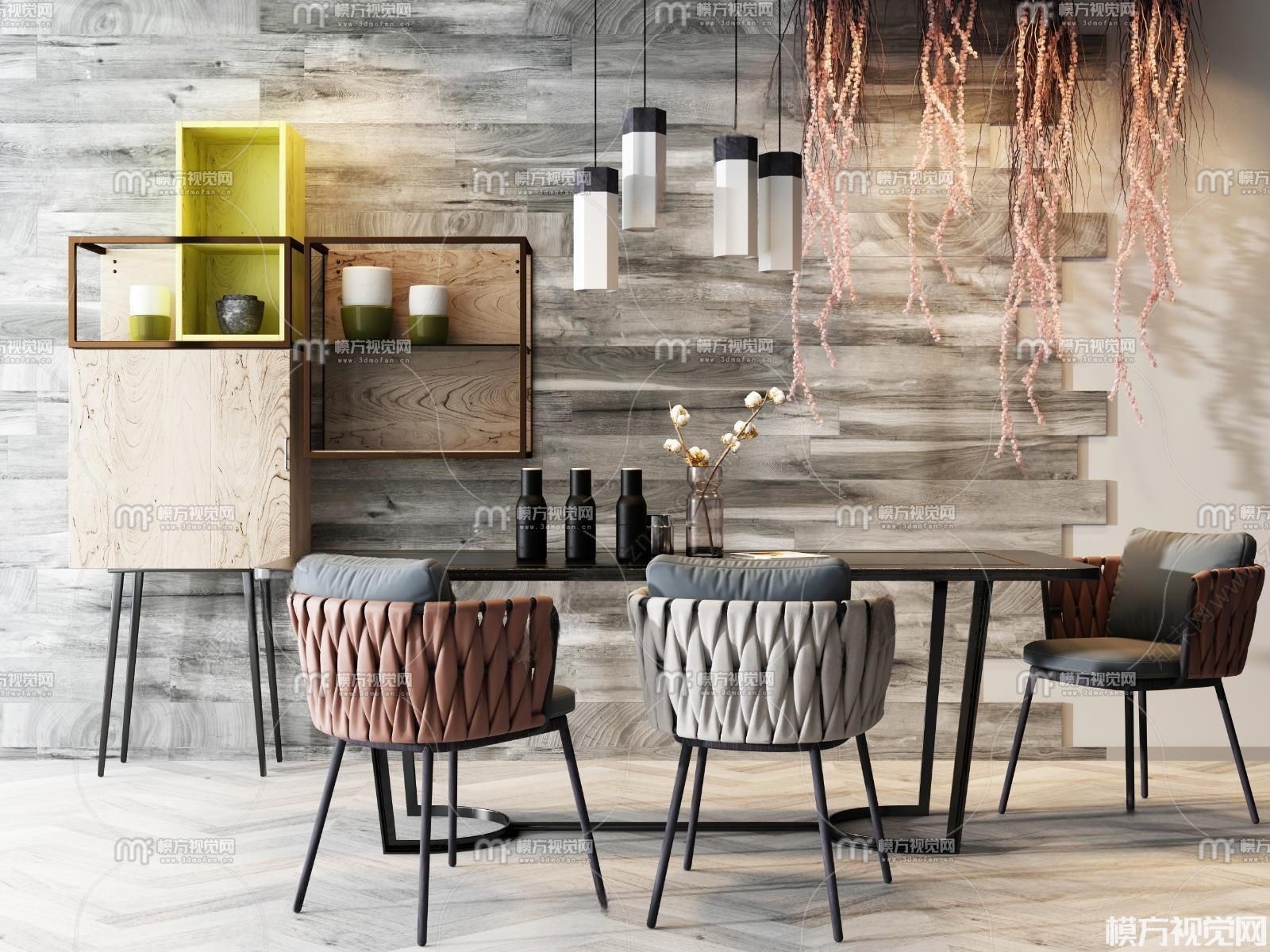 北欧餐桌椅边柜吊灯组合3D模型(ID:0013640)