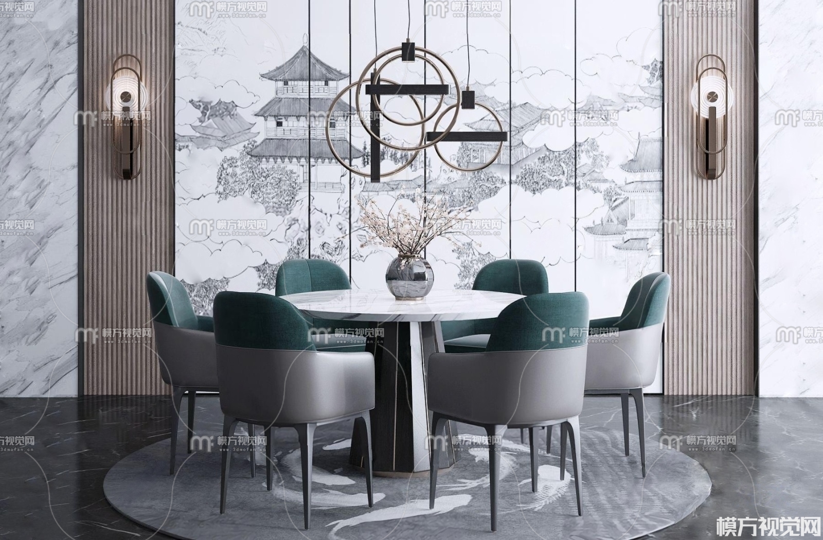新中式圆形餐桌椅组合3D模型(ID:0014065)