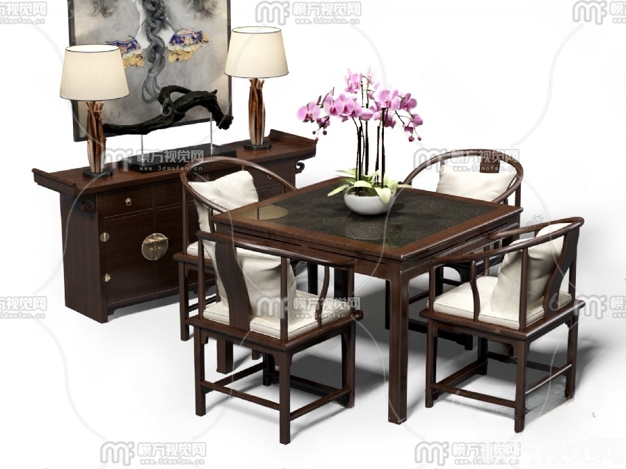 中式桌椅 边柜组合3D模型(ID:0001473)