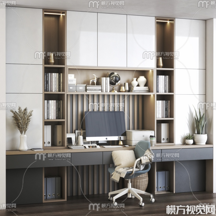 现代一体式书柜3D模型(ID:0017120)