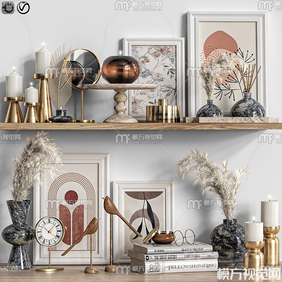 侘寂书籍烛台花瓶时钟摆件3D模型(ID:0017584)