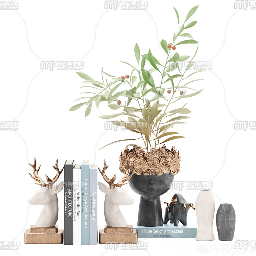 现代雕塑绿植盆栽书籍摆件3D模型(ID:0017784)