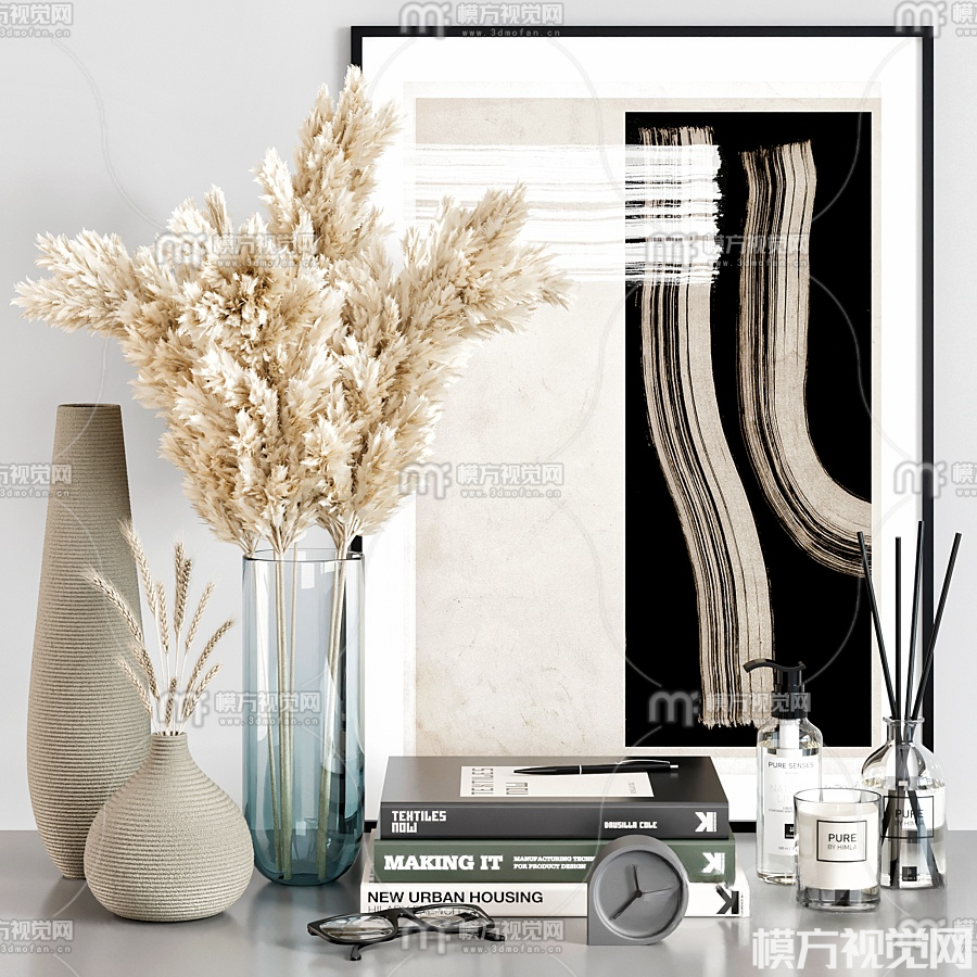 现代干芦苇花瓶书籍装饰画摆件3D模型(ID:0017815)