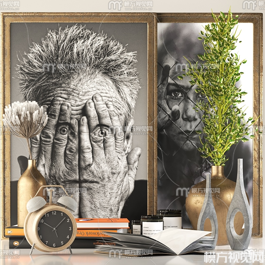 现代绿植花瓶闹钟器皿摆件3D模型(ID:0017924)