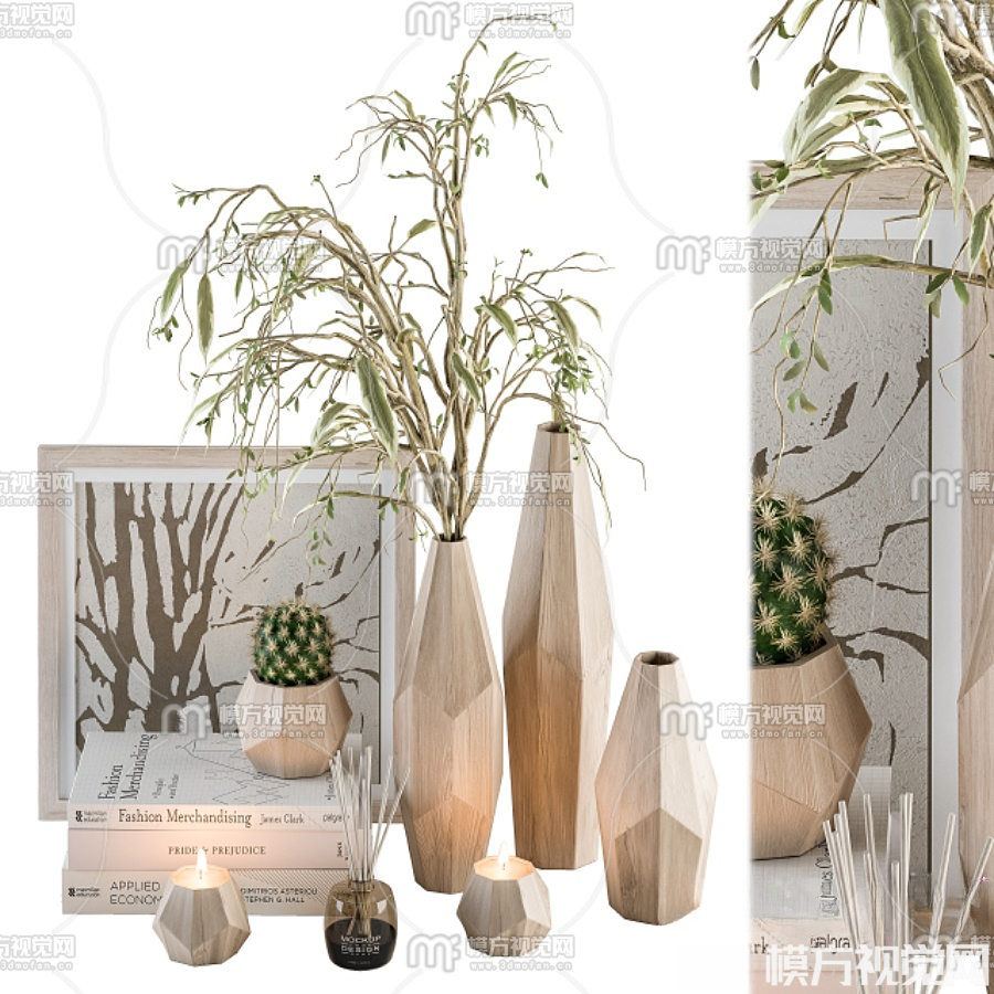 现代绿植花瓶书籍烛台摆件3D模型(ID:0017926)