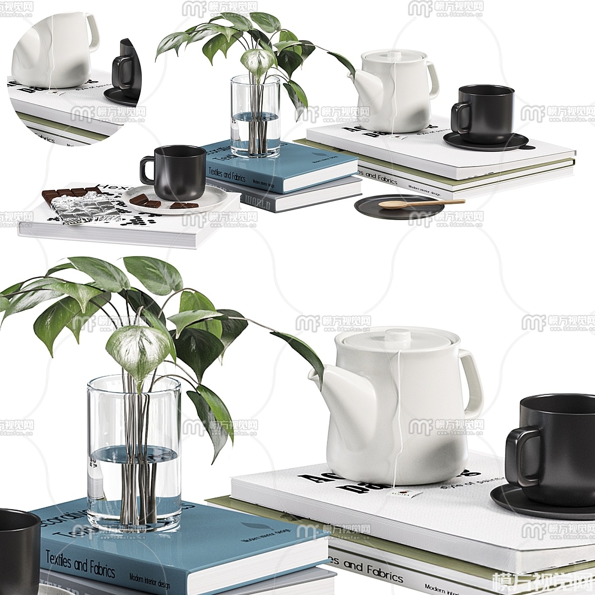 现代书籍 花艺 杯子 茶壶3D模型(ID:0018161)