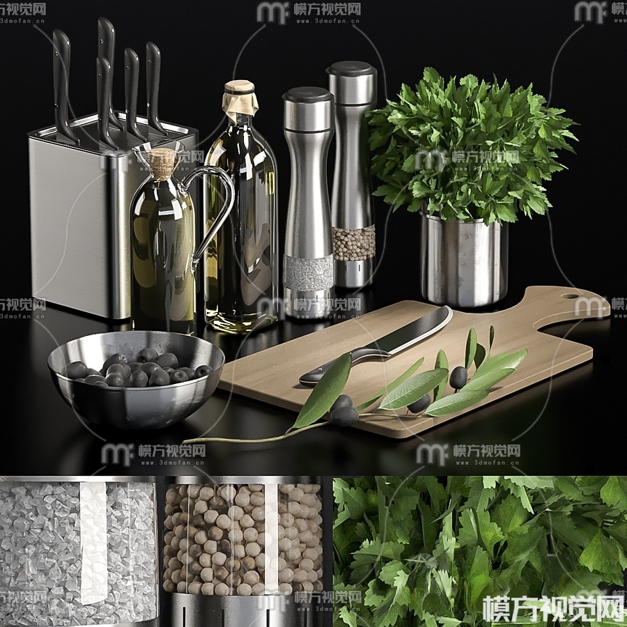 砧板 刀具 食用油 调味品3D模型(ID:0018648)