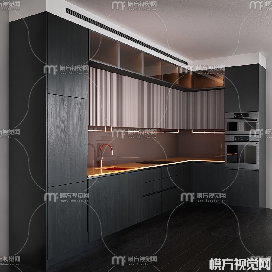现代黑胡桃转角厨房橱柜3D模型(ID:0018722)