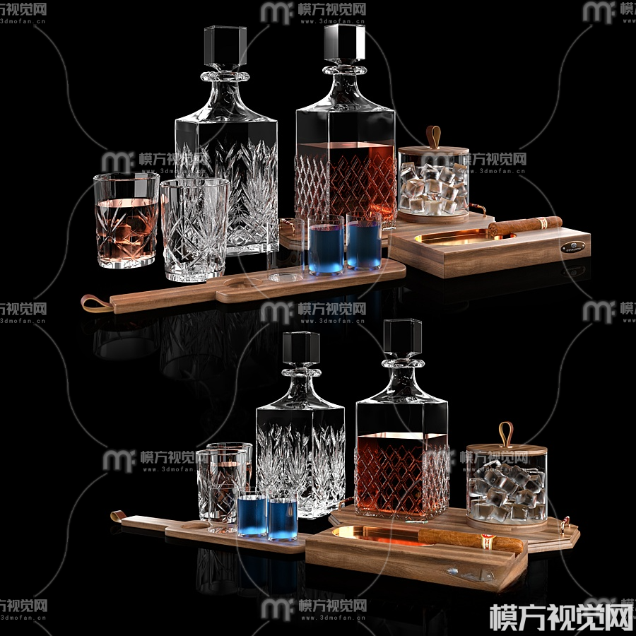 现代雪茄酒瓶酒杯洋酒3D模型(ID:0018762)