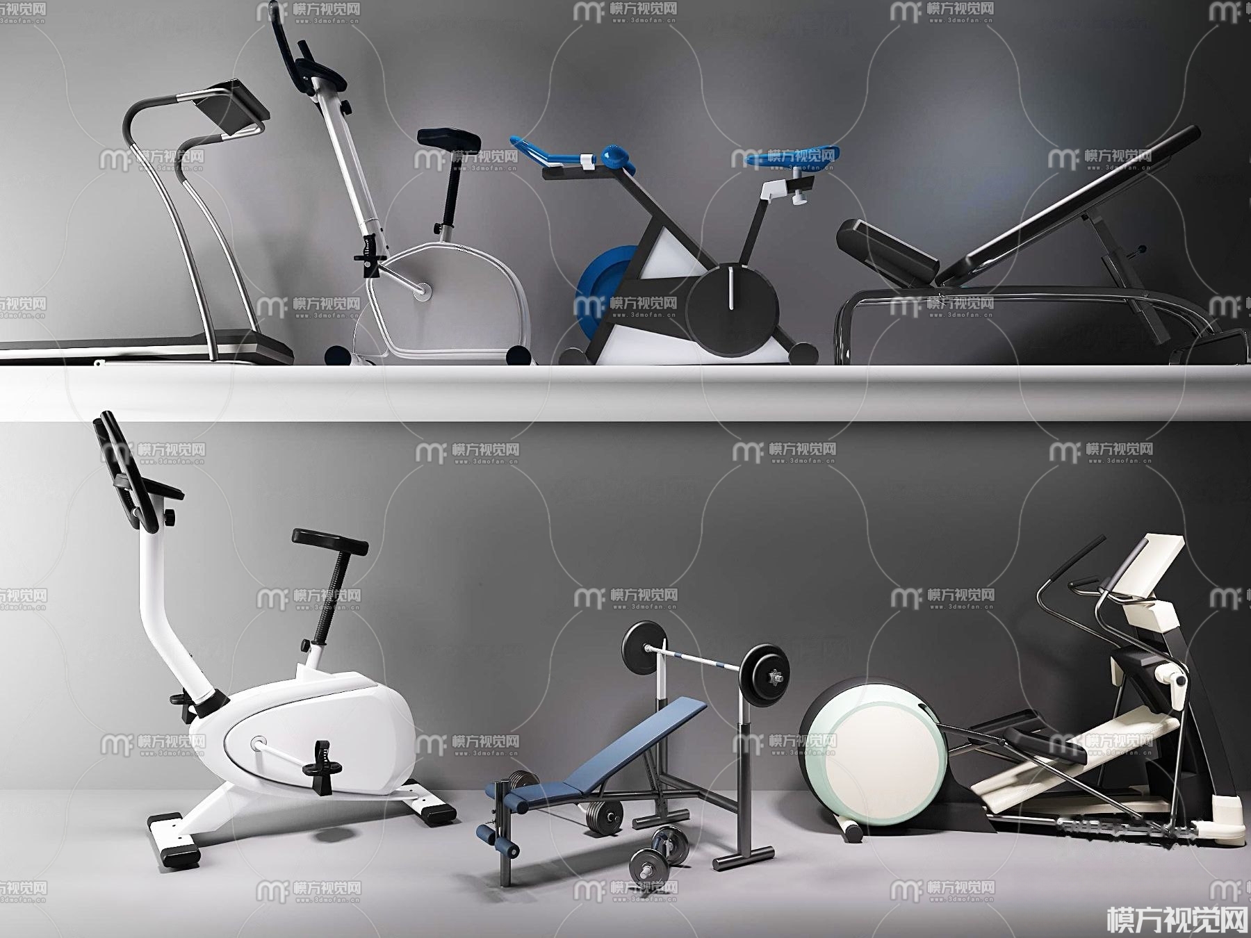 现代跑步机动感单车健身器材3D模型(ID:0019230)