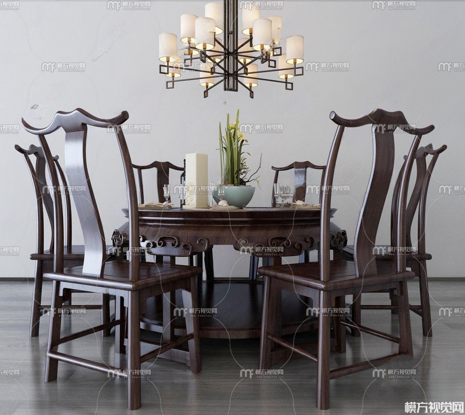 新中式圆形餐桌椅 吊灯组合3D模型(ID:0001989)