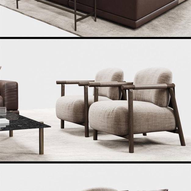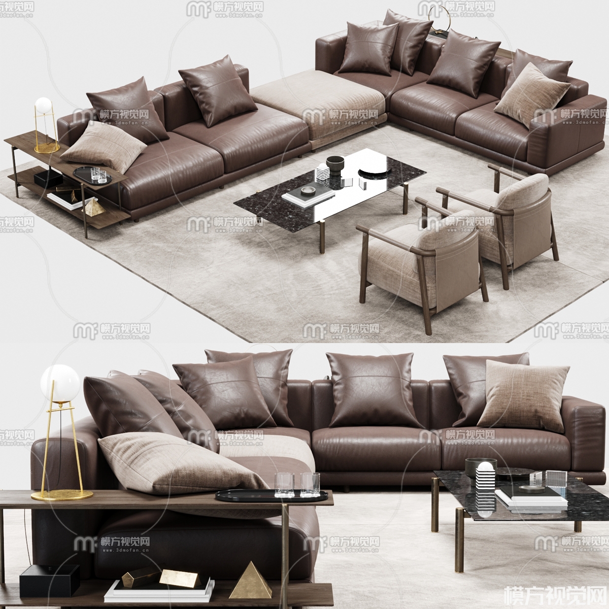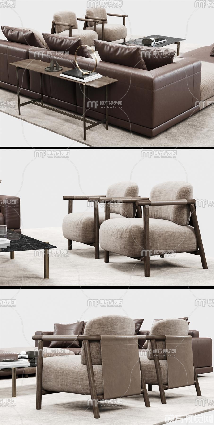 现代皮革沙发茶几组合3D模型(ID:0021107)