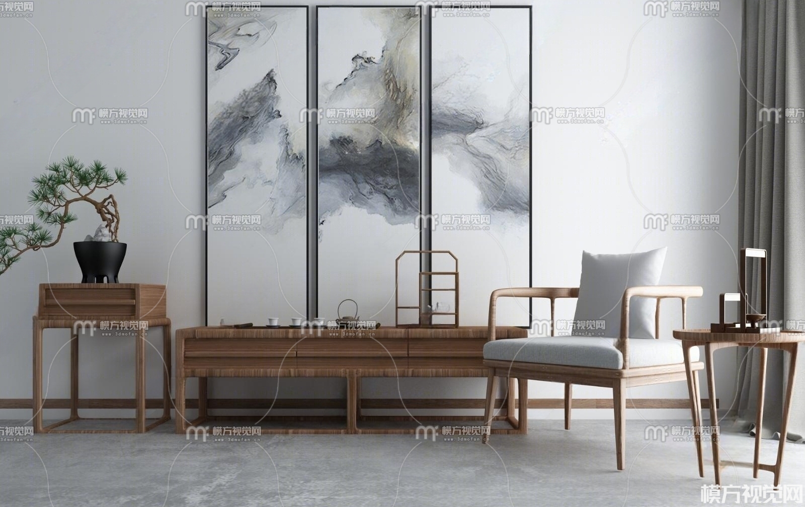 新中式茶几 休闲椅 装饰画组合3D模型(ID:0002198)