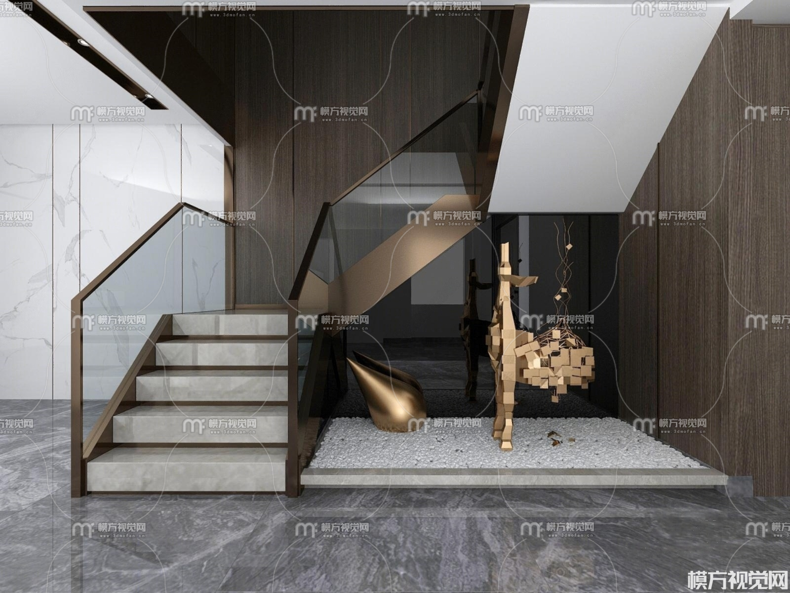 转角楼梯间 玻璃栏杆3D模型(ID:0022032)
