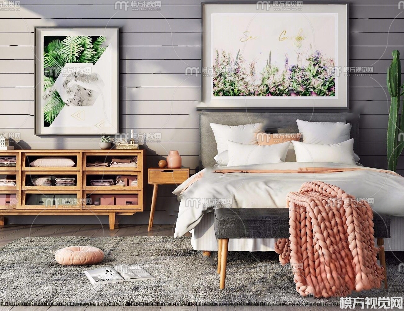 北欧双人床 边柜3D模型(ID:0002209)
