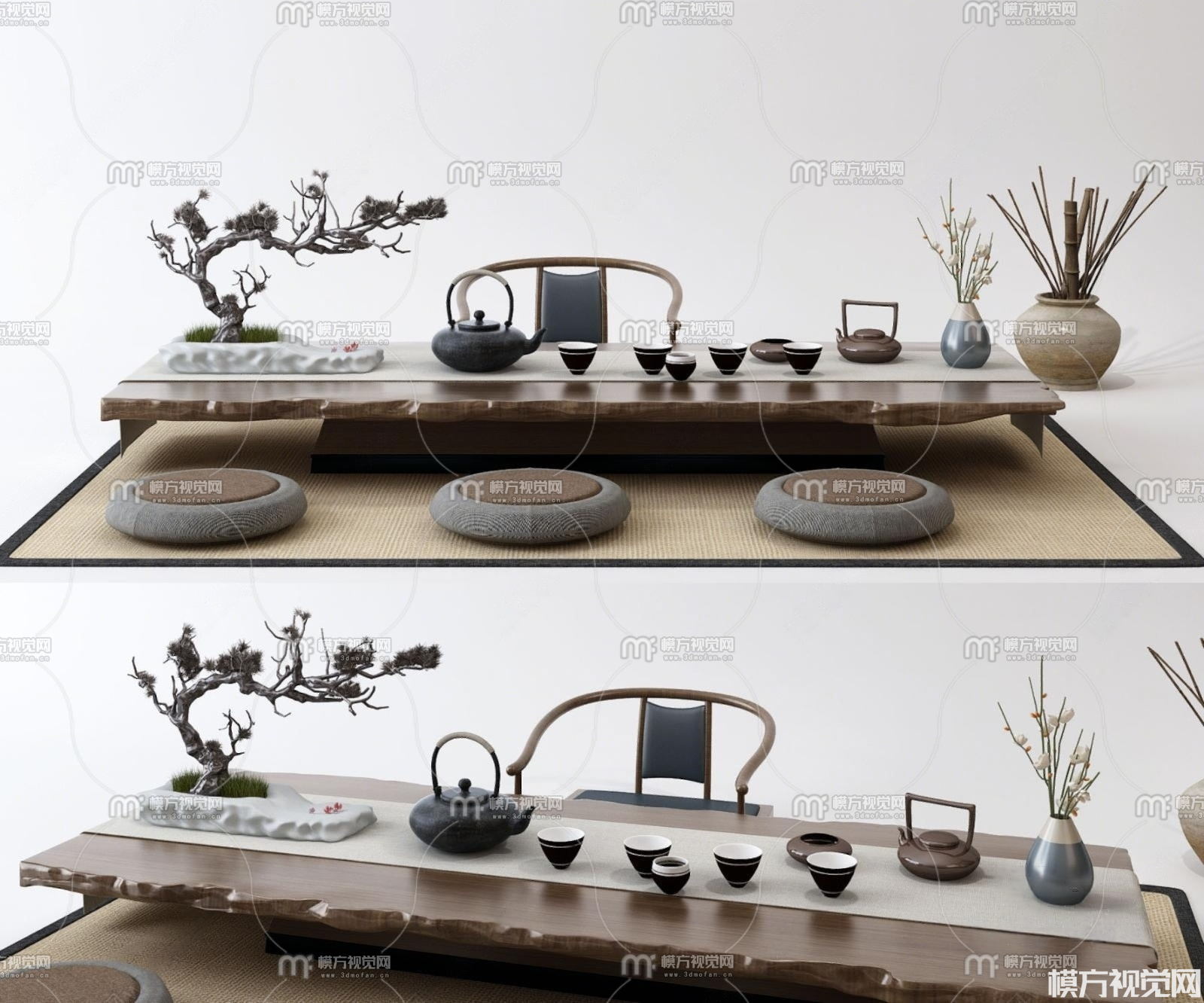 新中式榻榻米 茶桌 茶具摆件3D模型(ID:0022148)