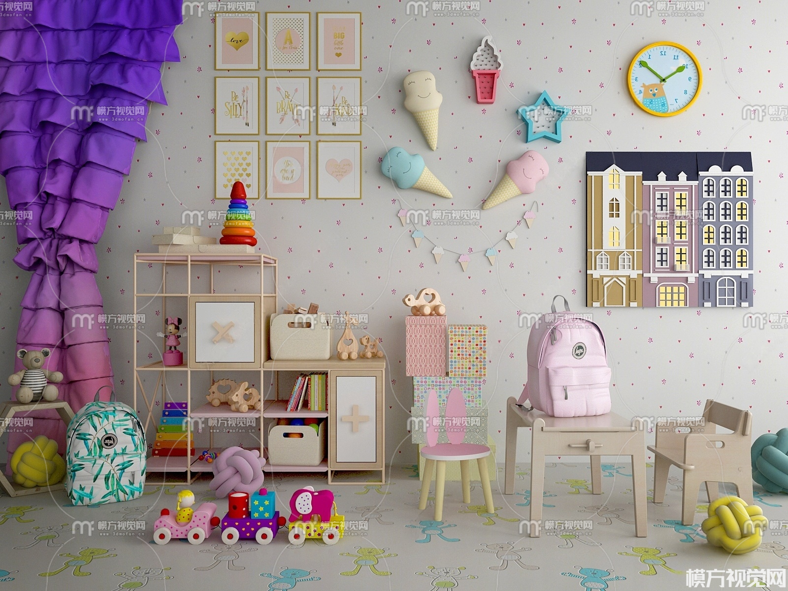 儿童桌椅 玩具 墙饰组合3D模型(ID:0023136)