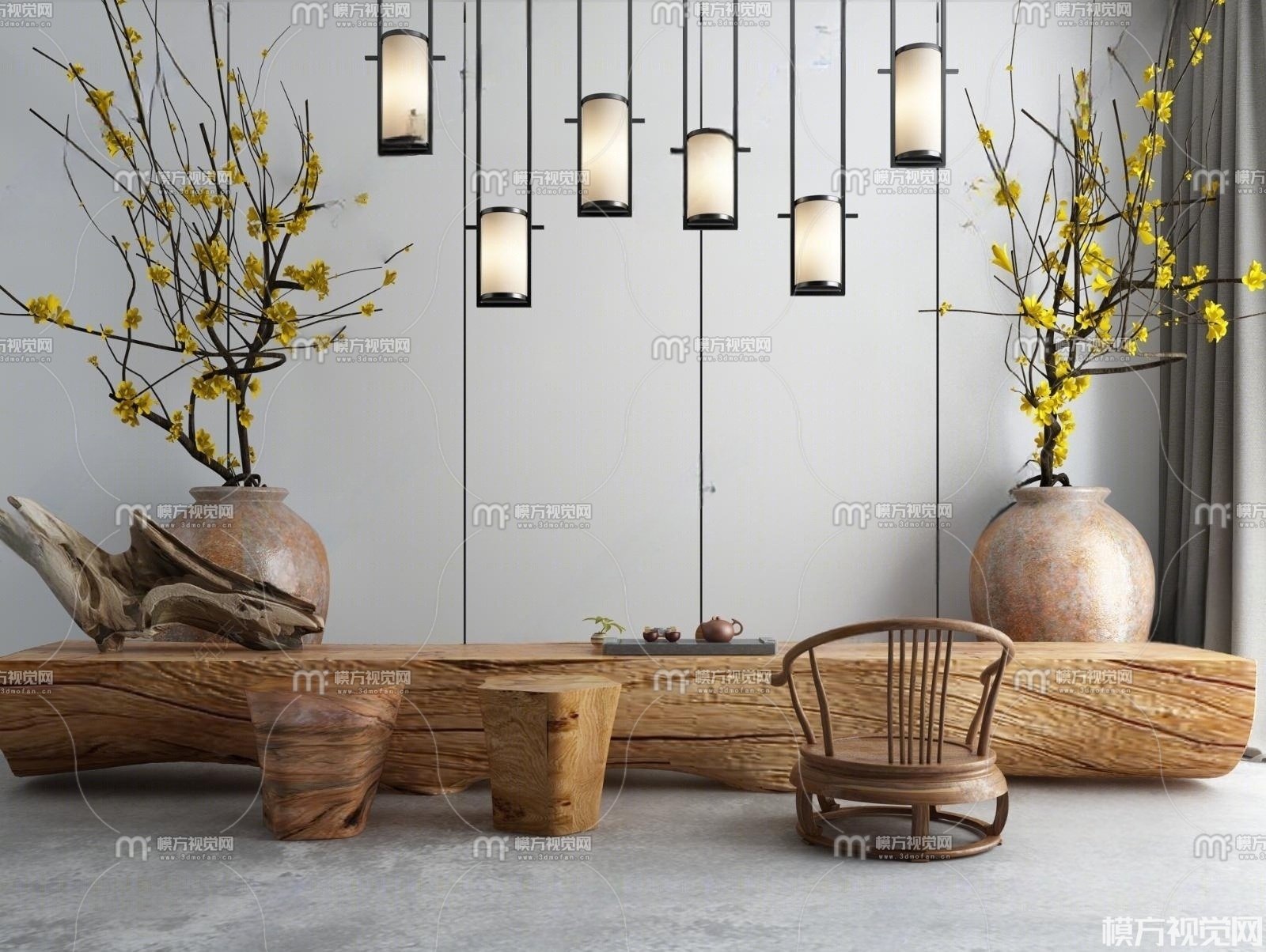 新中式茶台 吊灯组合3D模型(ID:0002314)