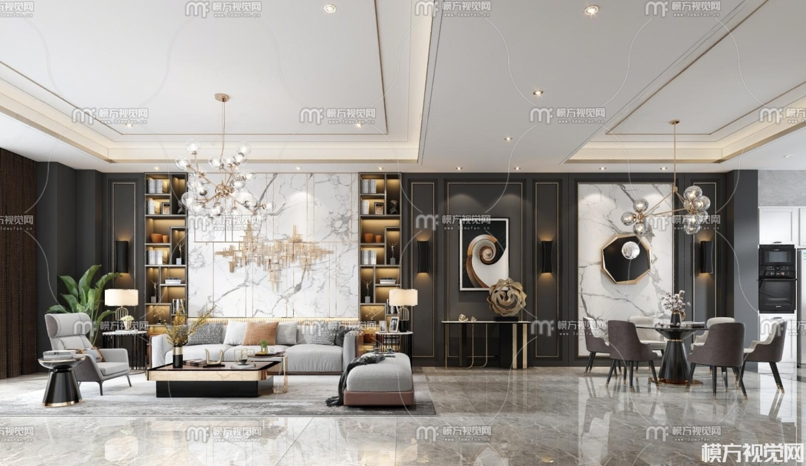 现代轻奢客厅餐厅3D模型(ID:0023858)
