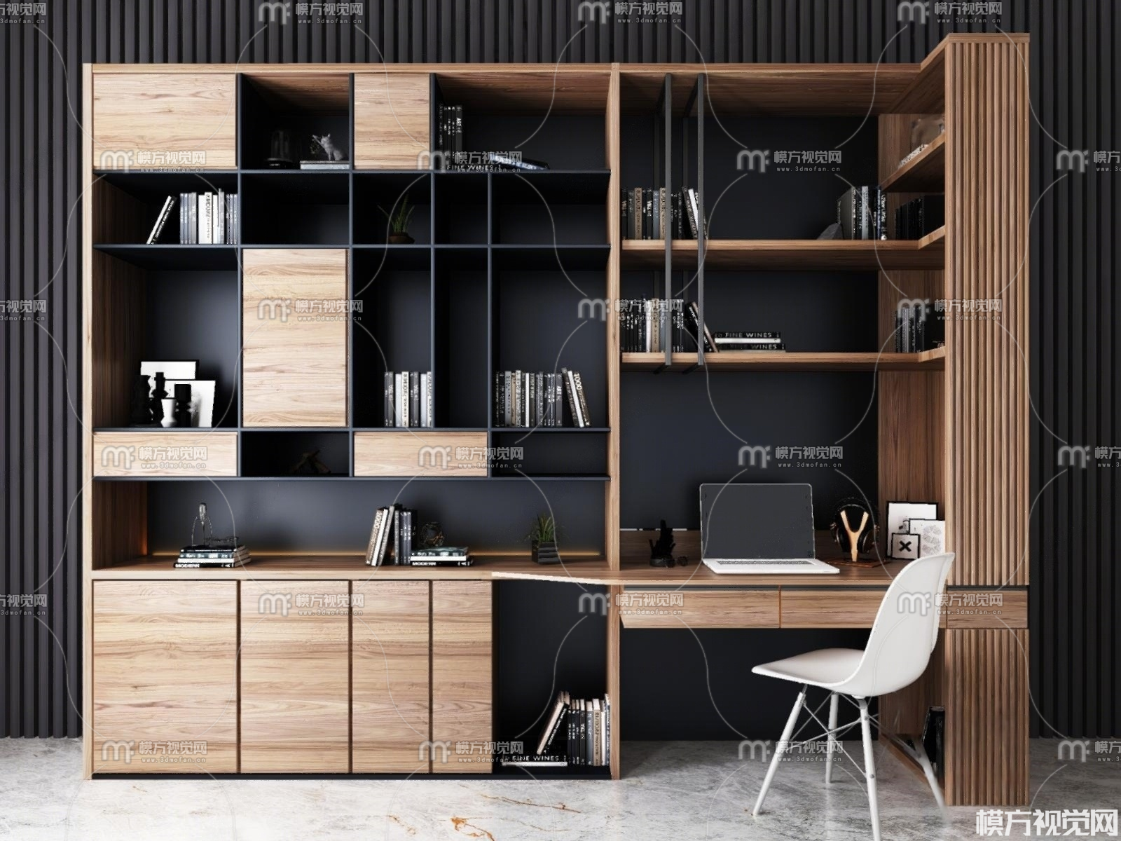 现代书柜 书桌椅组合3D模型(ID:0024120)