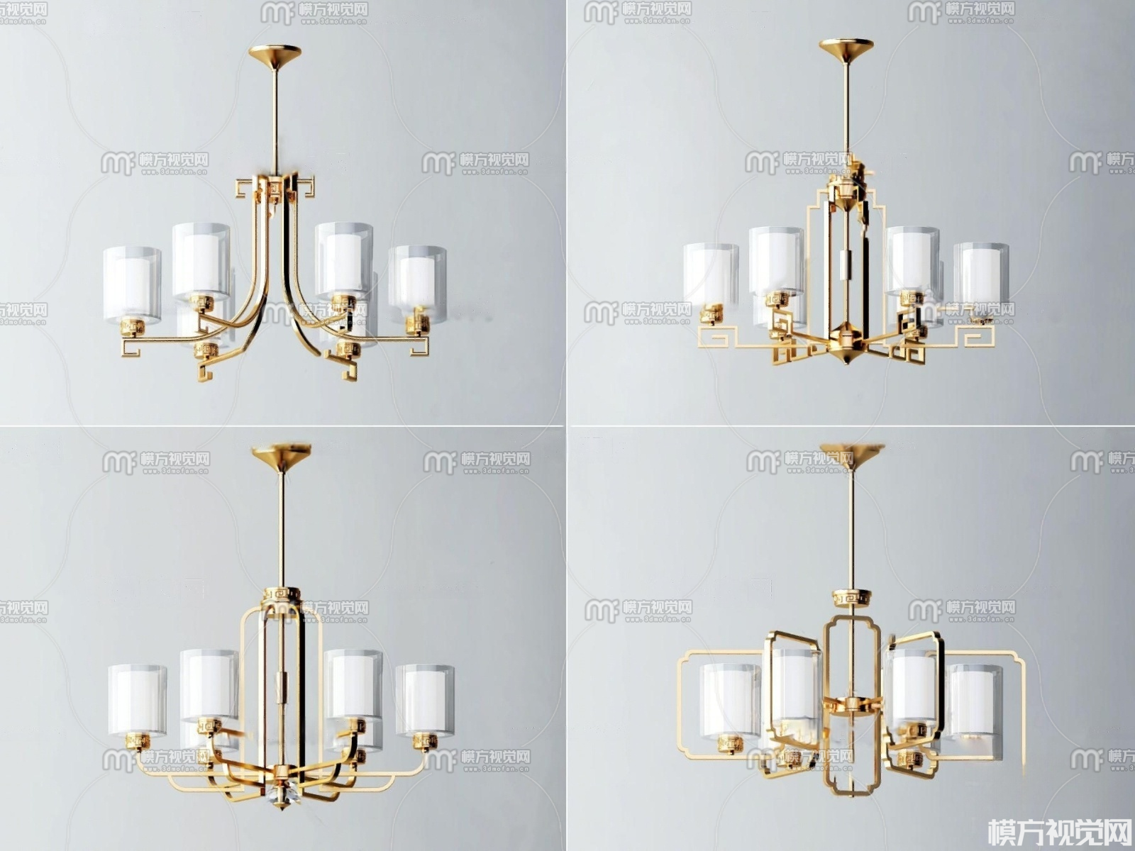 新中式金属玻璃多头吊灯组合3D模型(ID:0024862)