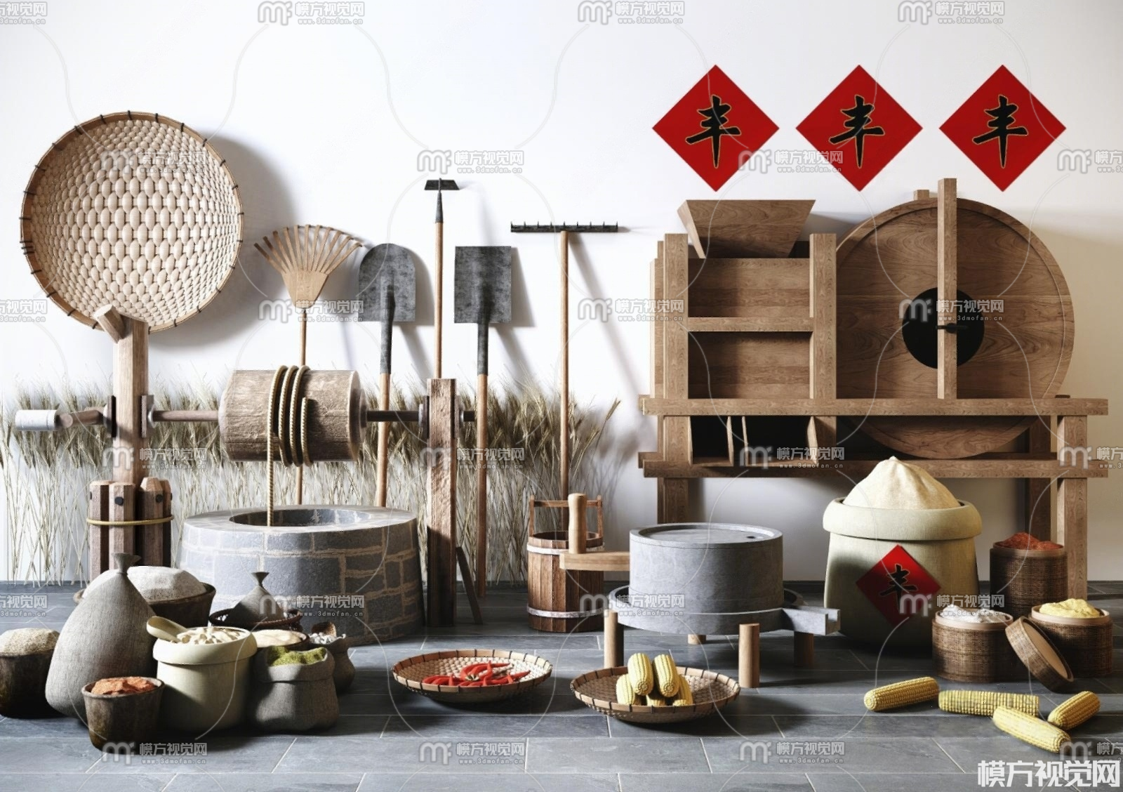石磨 簸箕 水井农具3D模型(ID:0025158)