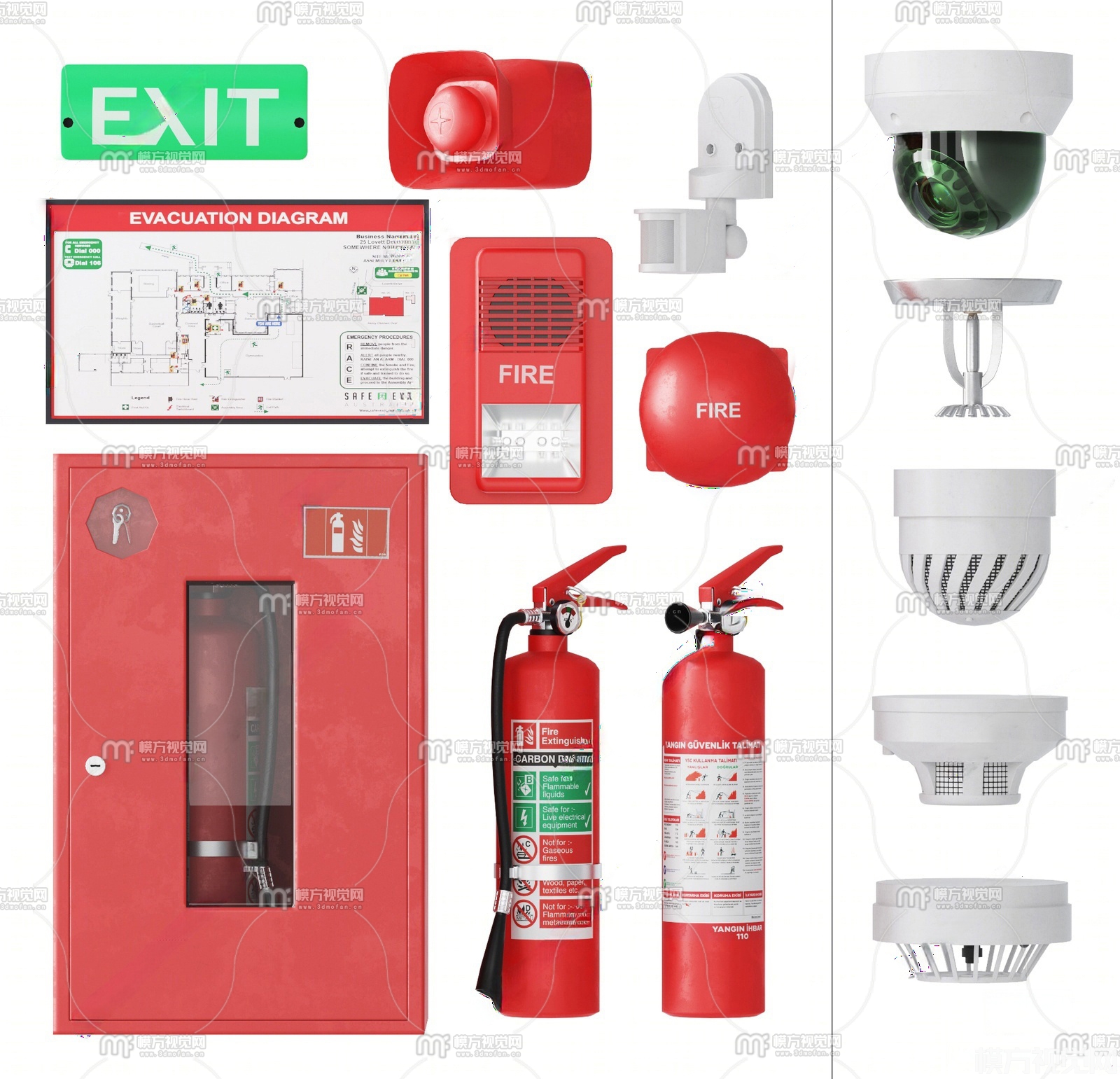 现代灭火器 烟感 喷淋3D模型(ID:0025320)