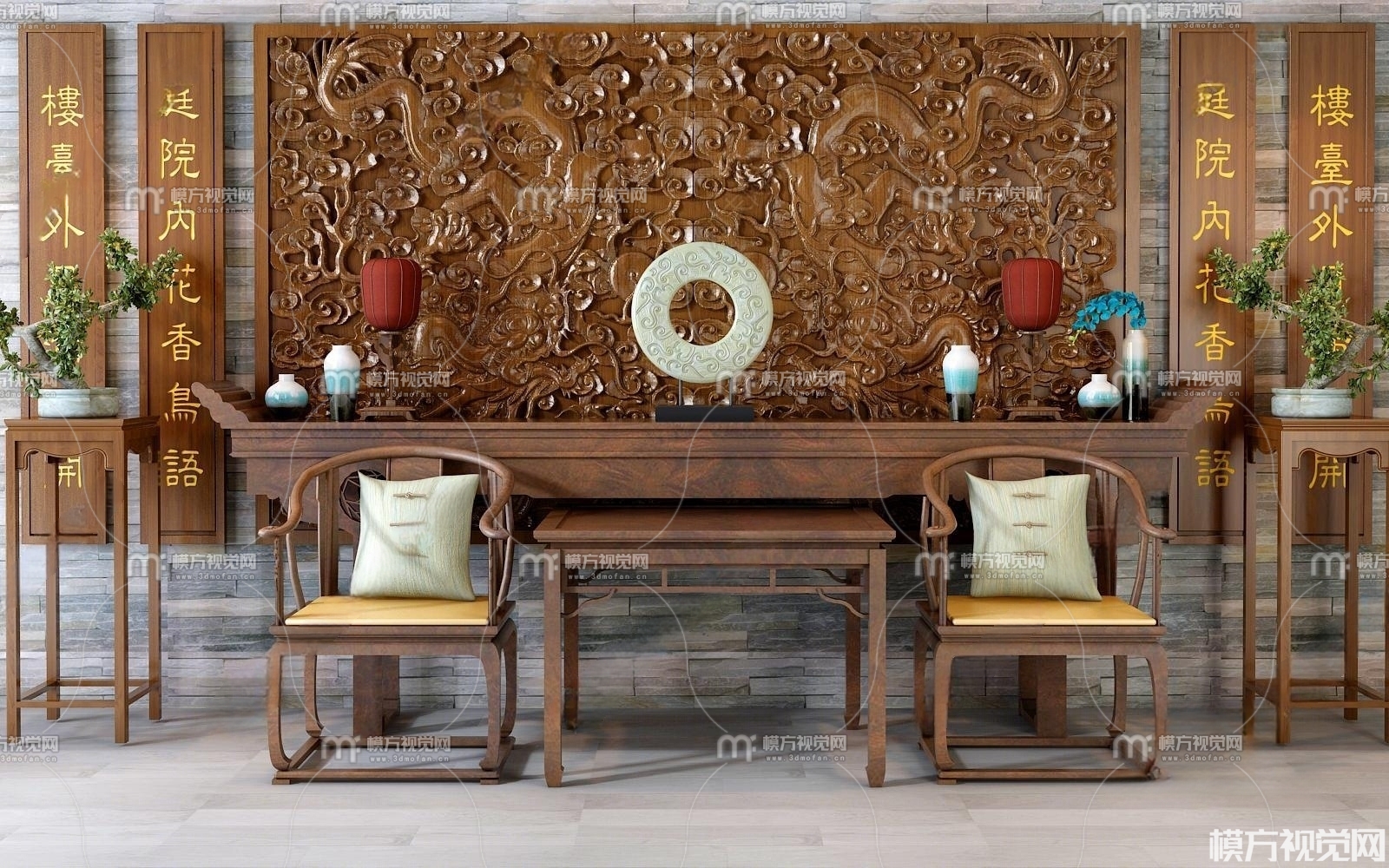 中式玄关实木条案桌椅组合3D模型(ID:0002788)