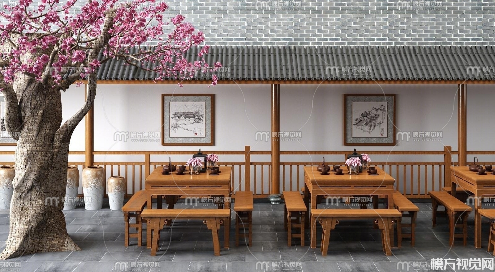 新中式餐馆餐桌椅组合3D模型(ID:0028118)