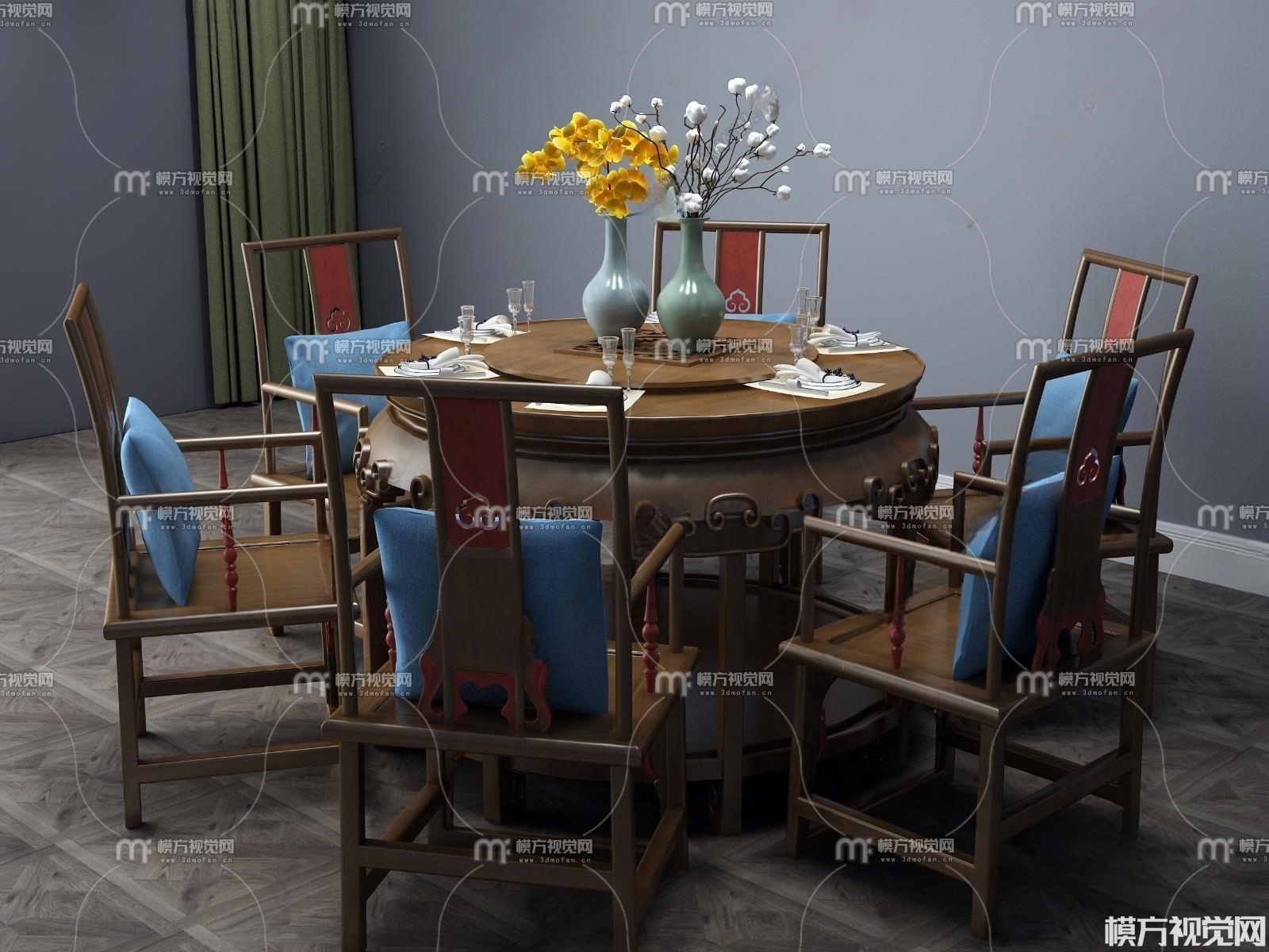 新中式圆形餐桌椅组合3D模型(ID:0002872)