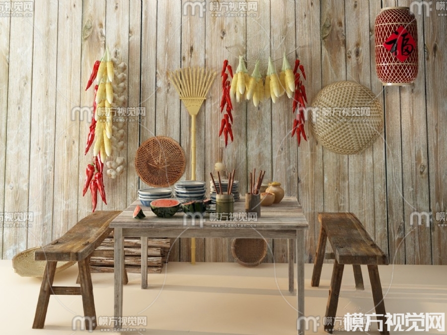 农家餐桌椅 餐具 农产品3D模型(ID:0028757)