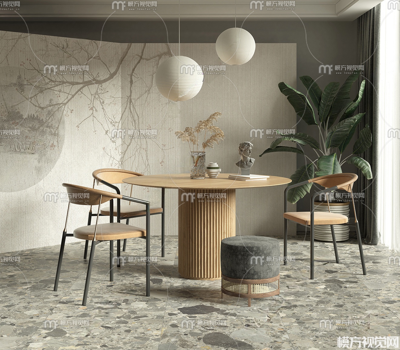 侘寂 圆形餐桌椅3D模型(ID:0029588)
