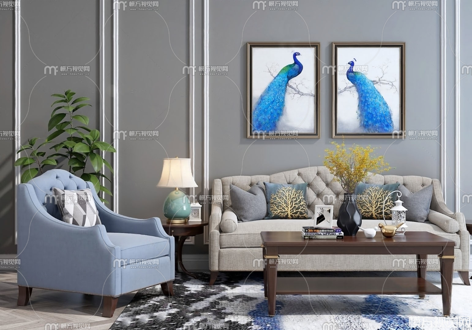 美式沙发茶几组合3D模型(ID:0030807)